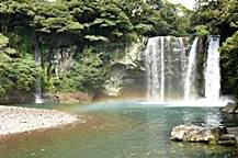 西帰浦にある、高さ22メートル、幅12メートルで、滝つぼの水深は20メートルという壮観を誇る天地淵瀑布。「天地淵」とは神の池という意味を持つ言葉で、玉皇上帝に使える7人の天女が玉の笛を吹きながら雲の階段を下りて地上に降りてきて、この池で沐浴をしたという伝説が残っています。ここは天然記念物163号にも指定されている膽八樹が自生しているところで、それ以外にも様々な珍しい植物や様々な木々が鬱蒼とした森を成しています。天然記念物379号として保護されているこの森に1キロの散策路があり、それに沿って歩くと滝にでます。