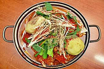 最近日本でも人気のカムジャタン。豚肉の背骨を長ネギやニンニク等香味野菜とと一緒に長時間煮込んでスープを作ります。そのスープに唐辛子、味噌など加え煮込んだ背骨肉、カムジャ、エゴマの葉などをくわえて煮込みます。 スープが染み込んだジャガイモと長時間煮込まれて、骨からすっと取れる肉のバランスが絶妙な煮込み料理です。