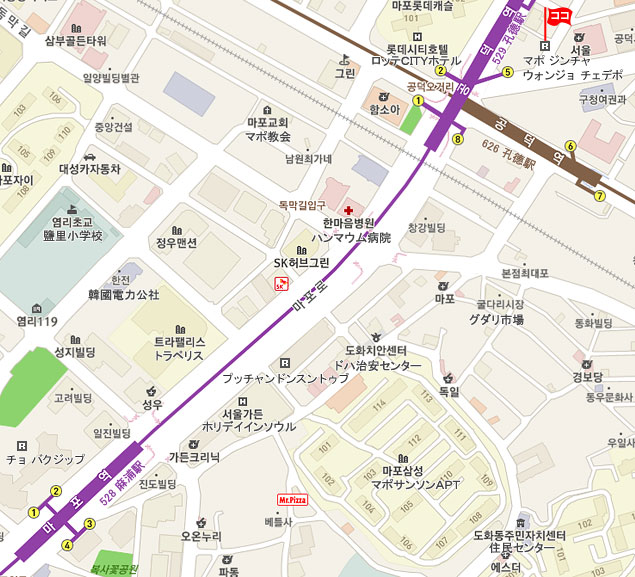 現地 アクセス  地下鉄5・6号線コンドッ(孔徳・Gongdeok・529/626)駅5番出口から徒歩約3分