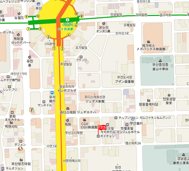 現地 アクセス  地下鉄1号線、ソミョン(西面・Seomyeon)駅2番出口から徒歩約10分