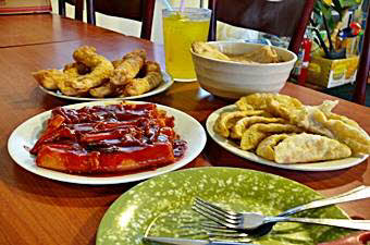 よくある真っ赤なソースと違い、こちらの赤茶色がかったソースはご主人が研究を重ねた自家製ソース。ベースになるコチュジャン(唐辛子味噌)が重要なポイントだとか。 午前中にしっかり仕込みをするために午後からの営業になるんだそうです。サイドメニューの天ぷらや餃子もこのソースによく合います。