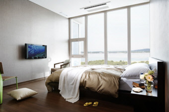 ロイヤルスイートは広さ約54坪と更に快適な広さとなっており、3つのベッドルーム、2つのバスルーム、リビングルームにダイニング、更にテラスも準備されています。客室の様子は下の客室平面図をご参考ください。リゾート内にはプライベートビーチ、プール、イベントホール、PCルーム、各種レストラン、ドーナツショップ、お土産ショップなど様々な付帯施設が揃っています。特にクラブハウス2階にある創作レストラン「Mint(ミント」は店内全体がガラス張りとなり素晴らしい海の眺めを見ながら食事ができる人気の高いレストランで、韓国版「花より男子」のロケにも使われました。このクラブハウスは日本人建築家.安藤忠雄氏が設計し、日本からわざわざ訪れる方もいらっしゃるそうです。「Mint」は予約制となっており、レストランまではコンドミニアムのある建物前からシャトルバスも運行されています。