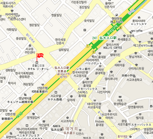 地下鉄 : 空港鉄道A`REXに乗車し、弘大入口駅(Hongik Univ.)駅で下車、1番出口から徒歩約5分。