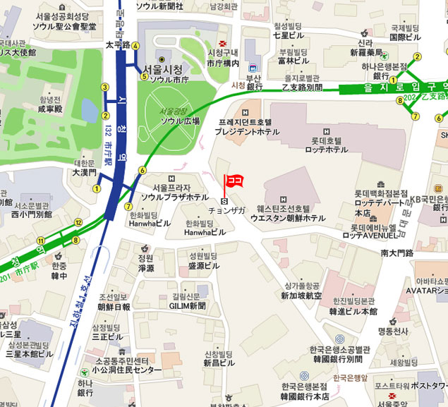 現地 アクセス  地下鉄 2号線の乙支路入口駅 (No.202 ウルチロイック・Euljiro 1(il)-ga)で降りて、