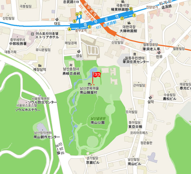現地 アクセス  地下鉄3、4号線「忠武路駅」3番または4番出口より徒歩約5分